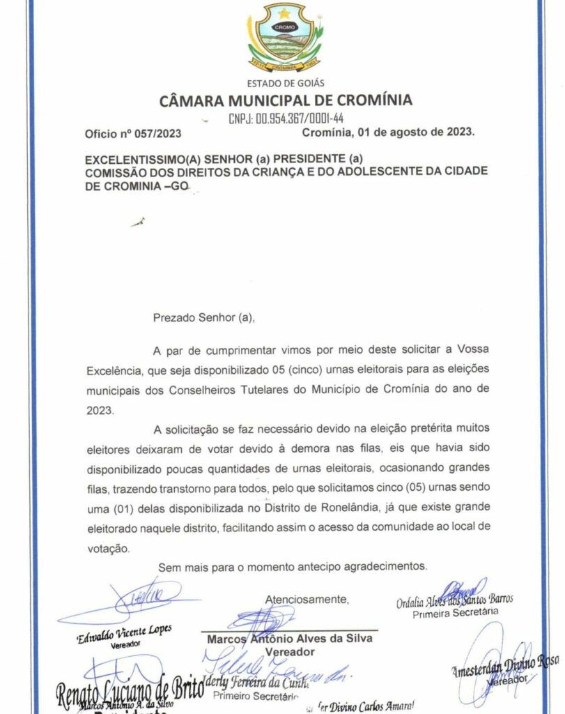 Ofício do Vereador Marcos Antônio destinado ao Ministério Público, a Justiça Eleitoral e ao Conselho Municipal dos Direitos da Criança e do Adolescente solicitando que seja disponibilizado 5 urnas eleitorais para as eleições municipais dos Conselheiros Tutelares de 2023.A solicitação foi feita para dar mais conforto e agilidade aos eleitores na hora da votação, evitando filas e para que os mesmos não fiquem sem votar.