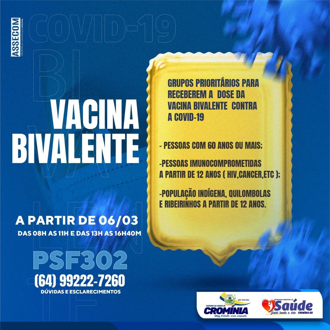 A Prefeitura Municipal através da Secretaria de Saúde iniciará a vacinação com as doses da vacina bivalente. As vacinas bivalentes são as chamadas segunda geração do imunizante, ou seja, são aquelas que possuem em sua composição a cepa original e subvariantes da Ômicron.